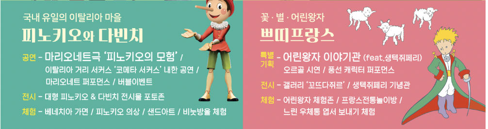 이탈리아 마을과 쁘띠프랑스 두 곳에서 다양한 체험과 공연이 준비되어 있습니다. 예를 들어, 베네치아 가면 만들기, 피노키오 의상 체험, 대형 피노키오 포토존 등 아이와 어른 모두가 즐길 수 있는 프로그램이 풍성합니다.
