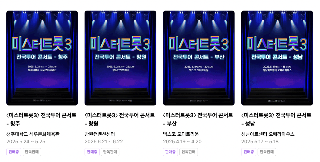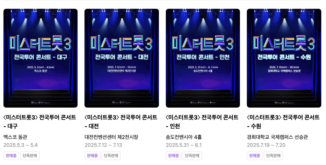 아래 링크를 통해 각 지역에서 열리는 미스터트롯 3 콘서트 티켓을 빠르게 예매하세요.