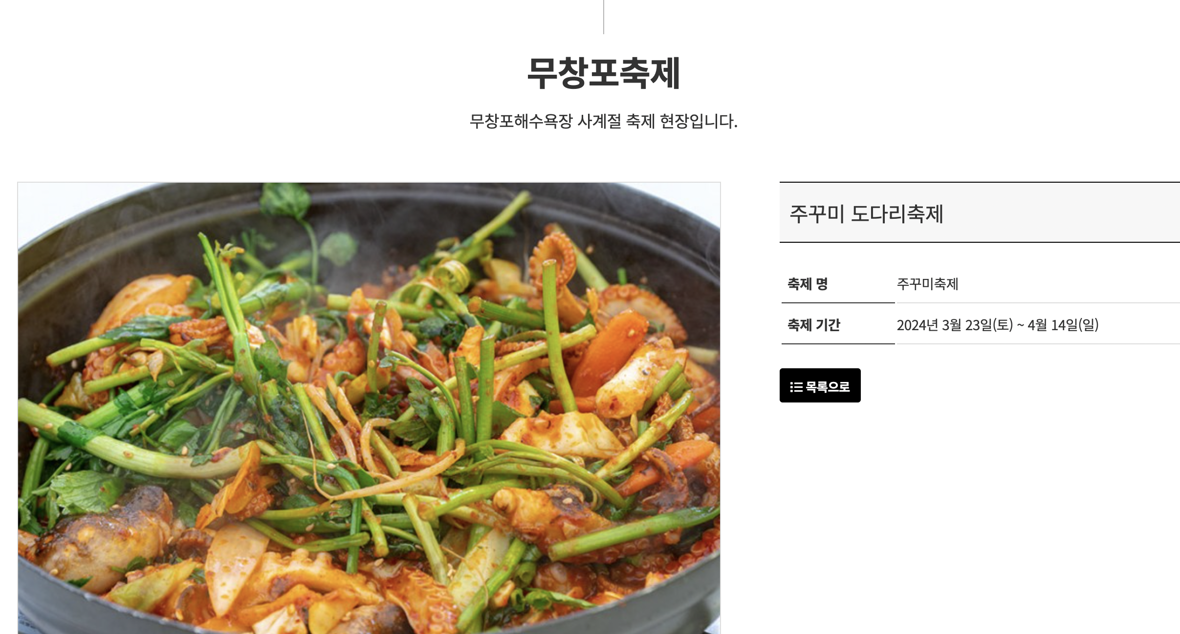 | 먹거리 장터 | 축제 기간 상시 운영 | 주꾸미, 도다리, 해산물 요리 시식 |