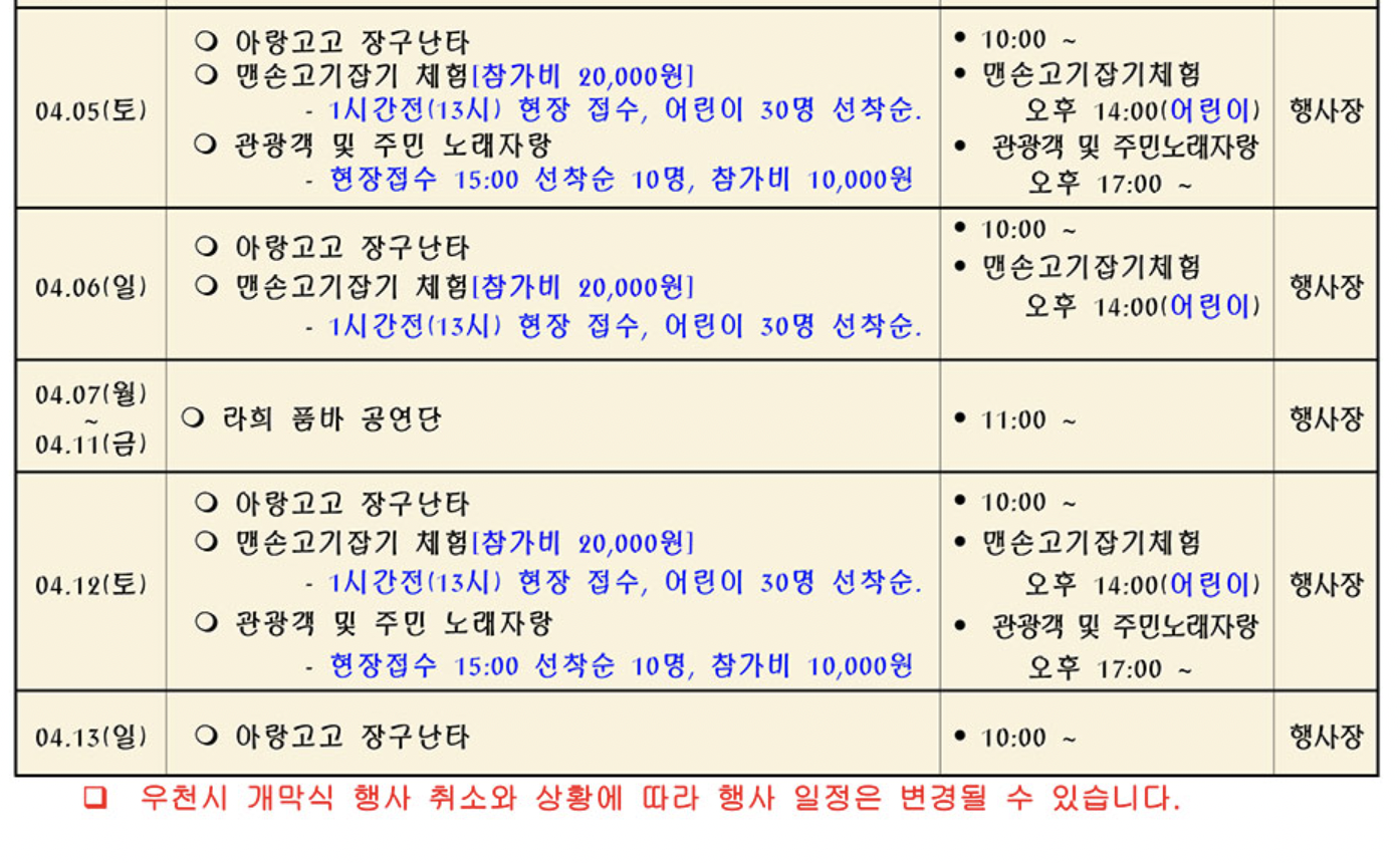 | 개막식 | 3월 22일 (토) 17:00 | 퍼레이드 & 지역 예술 공연 |